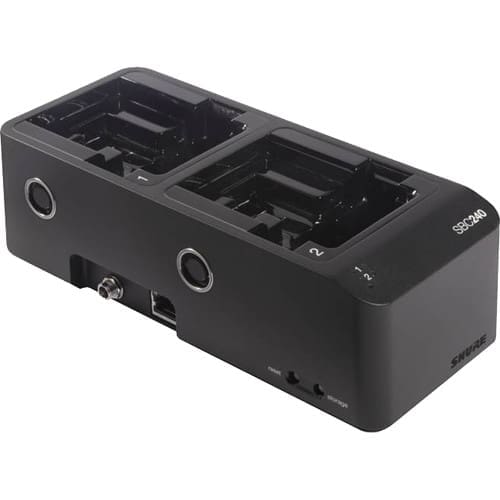De Shure SBC240 is een netwerklaadstation en biedt een compacte oplossing voor het opladen en opslaan van elke combinatie van twee SB910/SB920 accu’s of ADX1, ADX2 of ADX2FD zenders met Shure accu’s. De lader is geschikt voor netwerken, zodat de lader- en accuparameters op afstand kunnen worden gemonitord met Shure Wireless Workbench software. Sluit tot vier SBC240 laders samen aan om vermogen en netwerkconnectiviteit te delen. Laadt twee SB900A oplaadbare Li-Ion-batterijen op in een handige en compacte desktopeenheid.